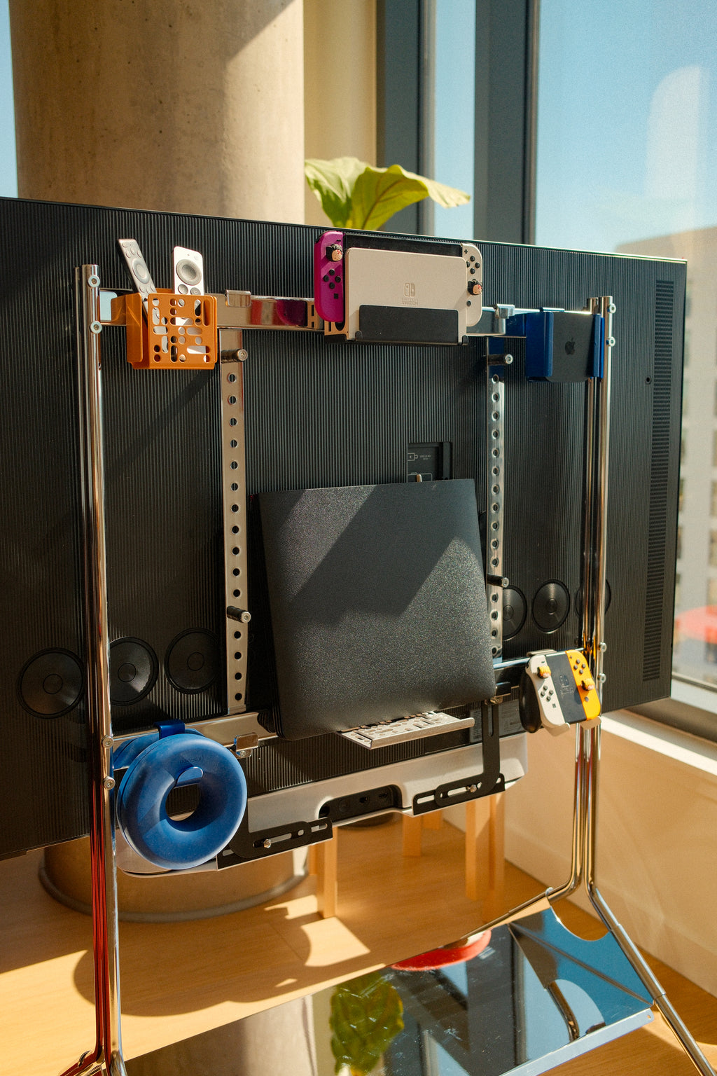 Se puede colocar directamente sobre el stand — completamente independiente de los orificios VESA — y es compatible con casi cualquier barra de sonido.